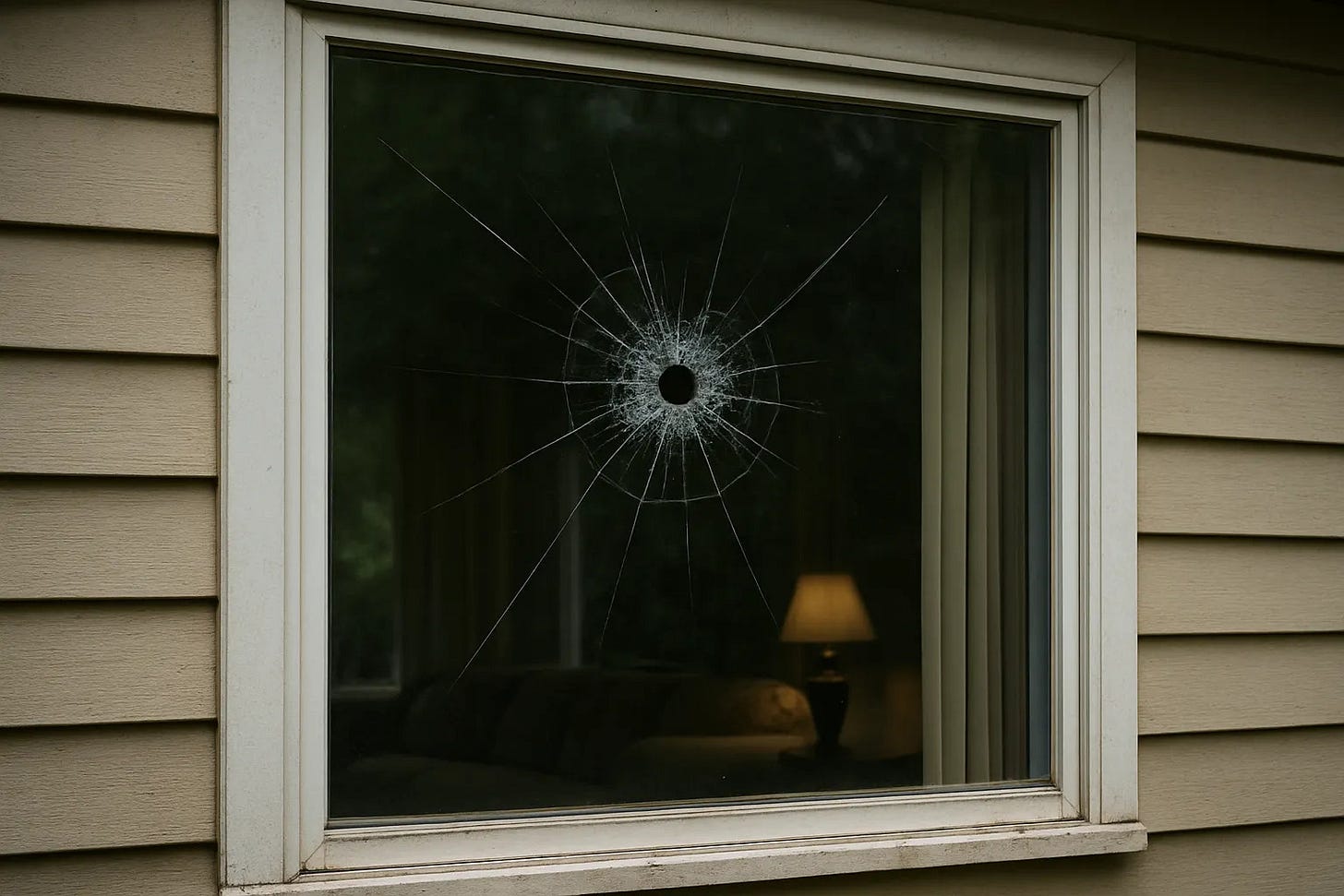 The first thing I noticed was a hole through a thick pane window at the front of the house.